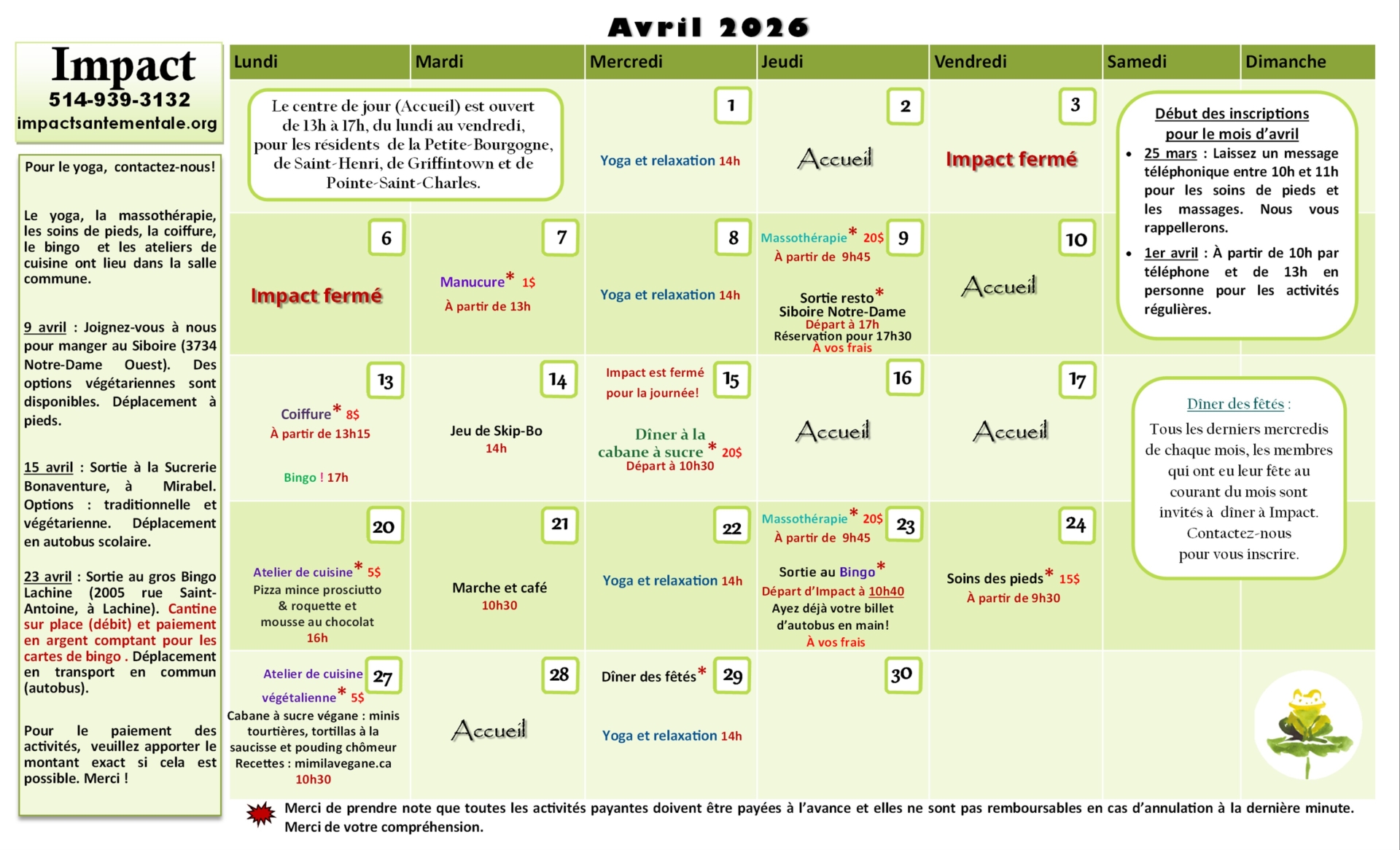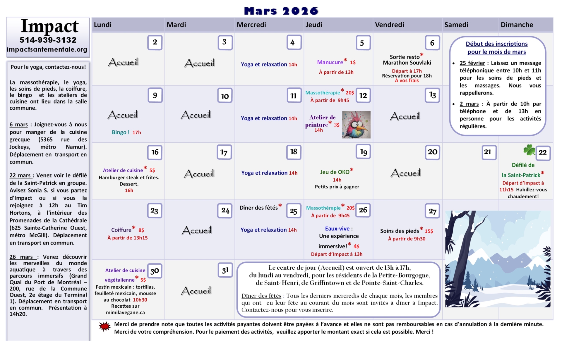 Here is our monthly calendar for the activities offered at the day center. Note that you must be a member to be able to access the organization and participate in our activities.