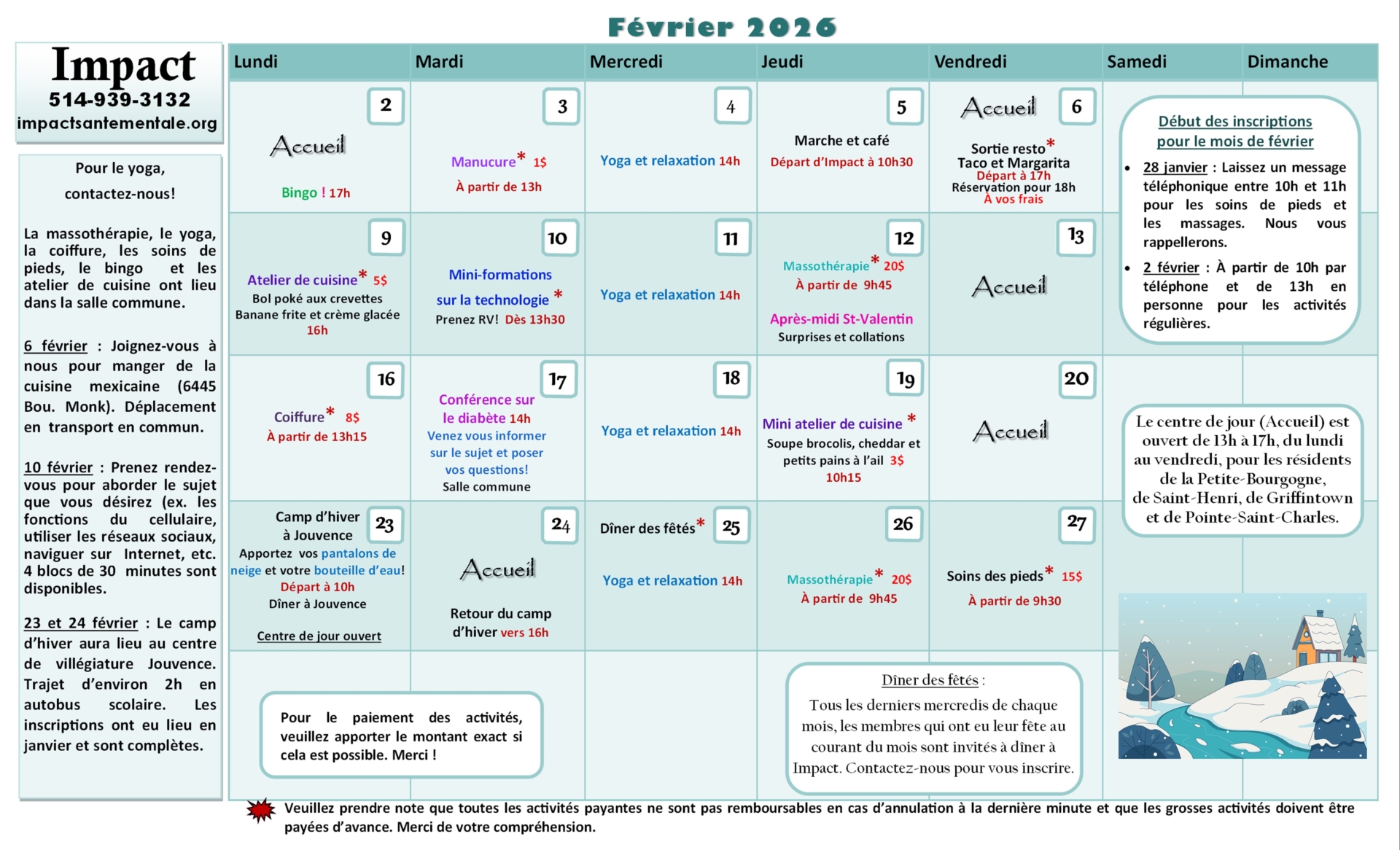 Here is our monthly calendar for the activities offered at the day center. Note that you must be a member to be able to access the organization and participate in our activities.